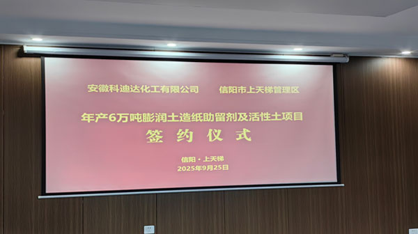 2025 年 9 月 25 日,安徽科迪达化工有限公司 “年产 6 万吨膨润土造纸助留剂及活性土项目” 签约仪式在河南信阳上天梯管理区顺利举行。该项目的签约标志着公司在产能扩张与战略布局优化上迈出关键步伐。